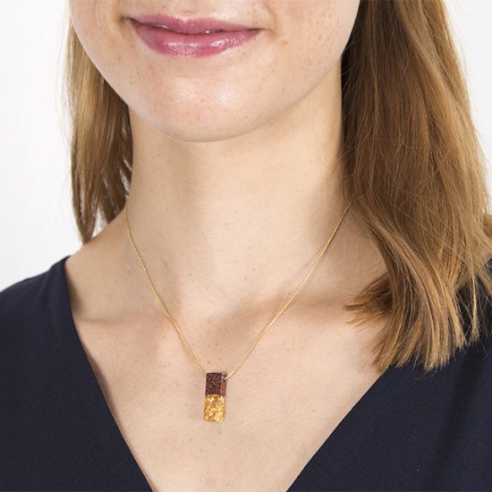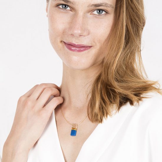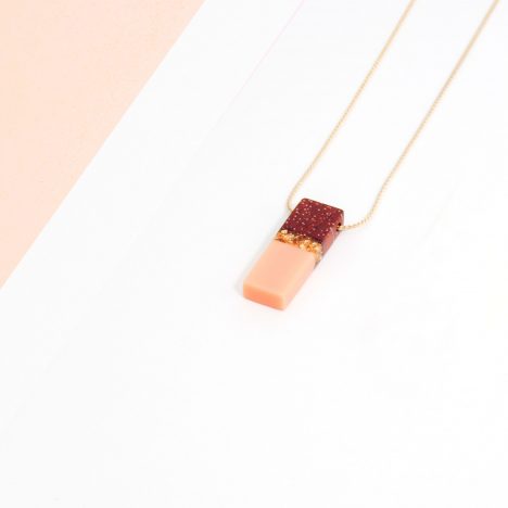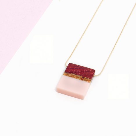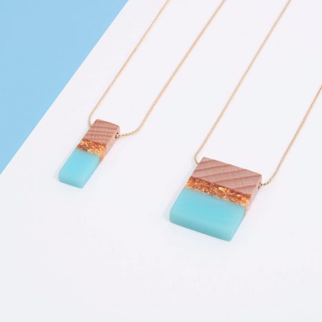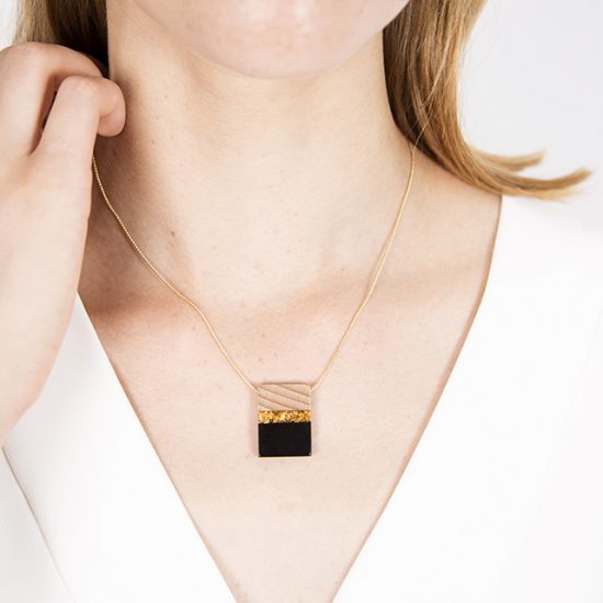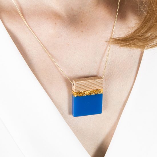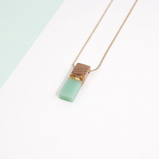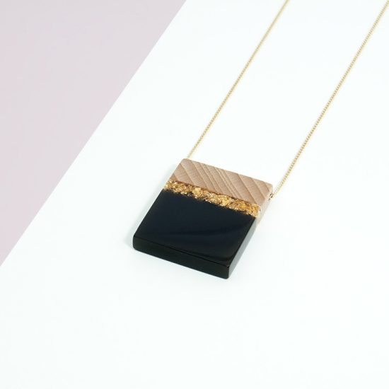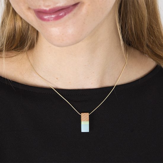 Piezas de madera y esmalte frío con una fina cadena chapada en oro de 18k.