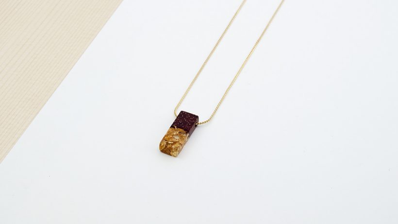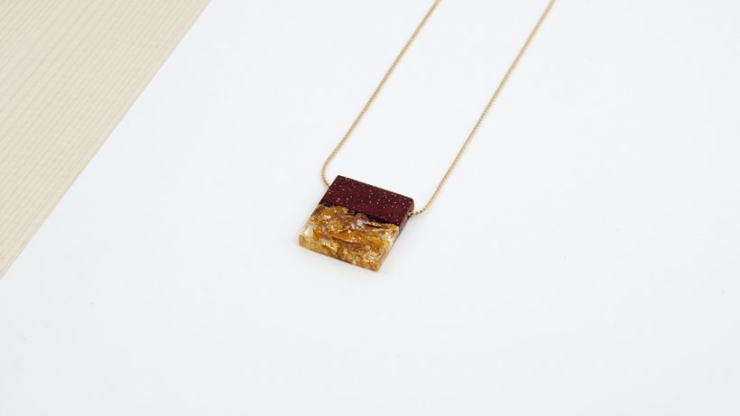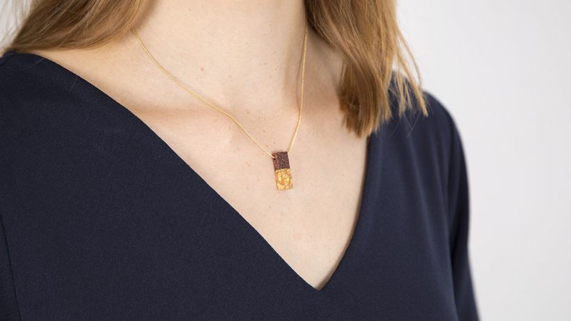 Collar perteneciente a la Colección Aura realizada con madera y esmalte frío con virutas de oro